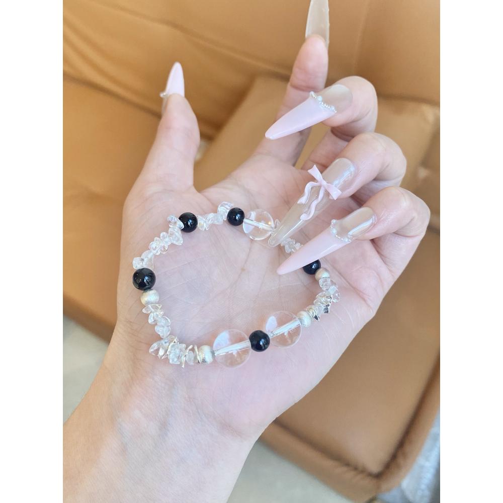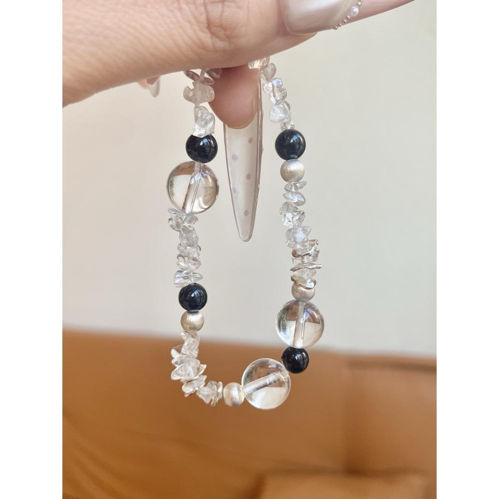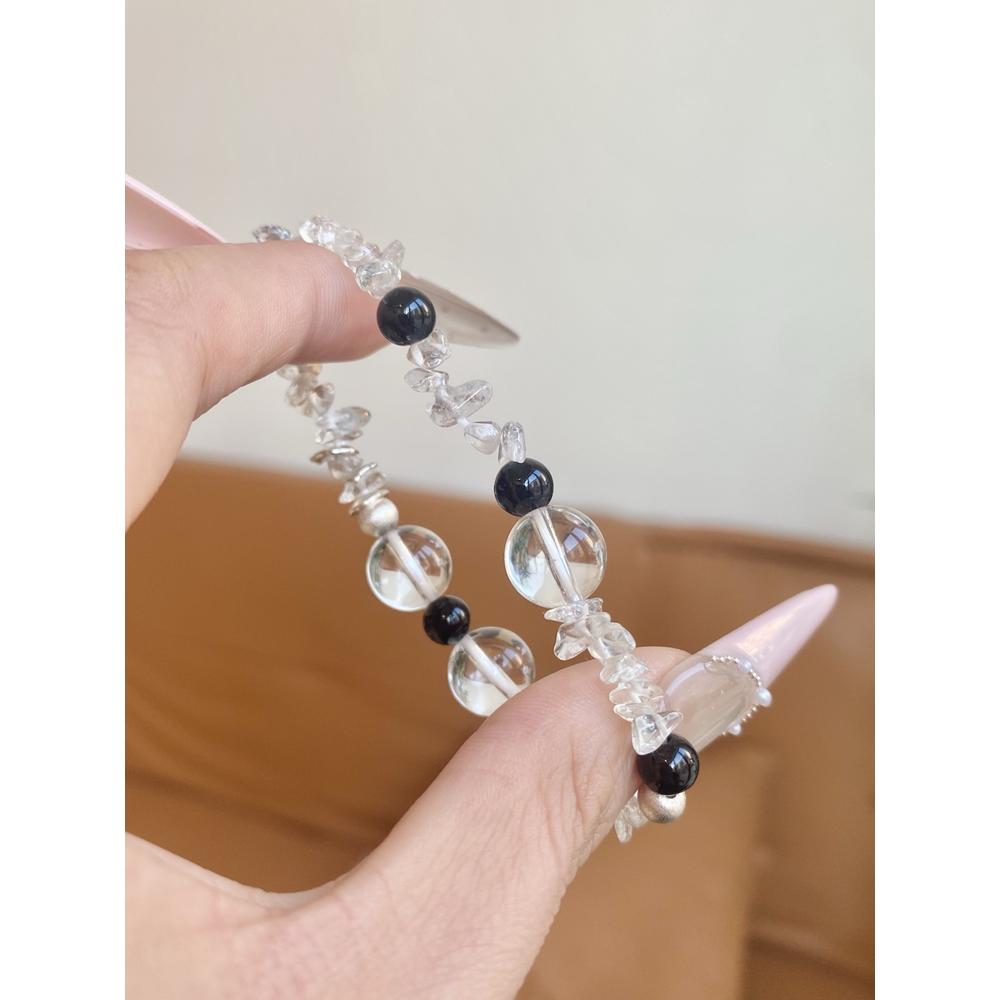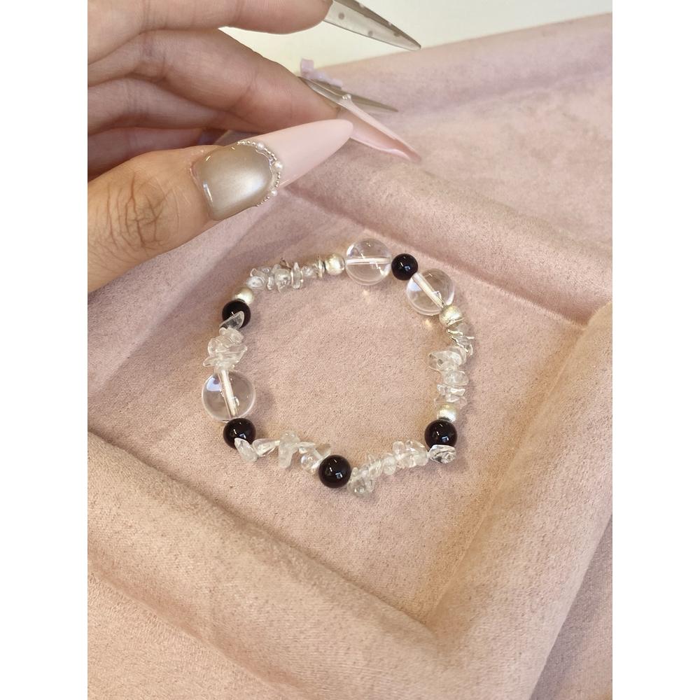 Frosted Clarity Clear Quartz & Black Bead Stretch Bracelet