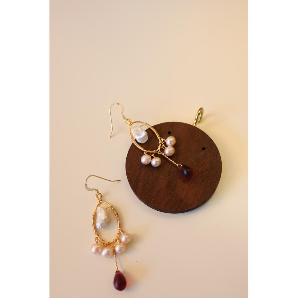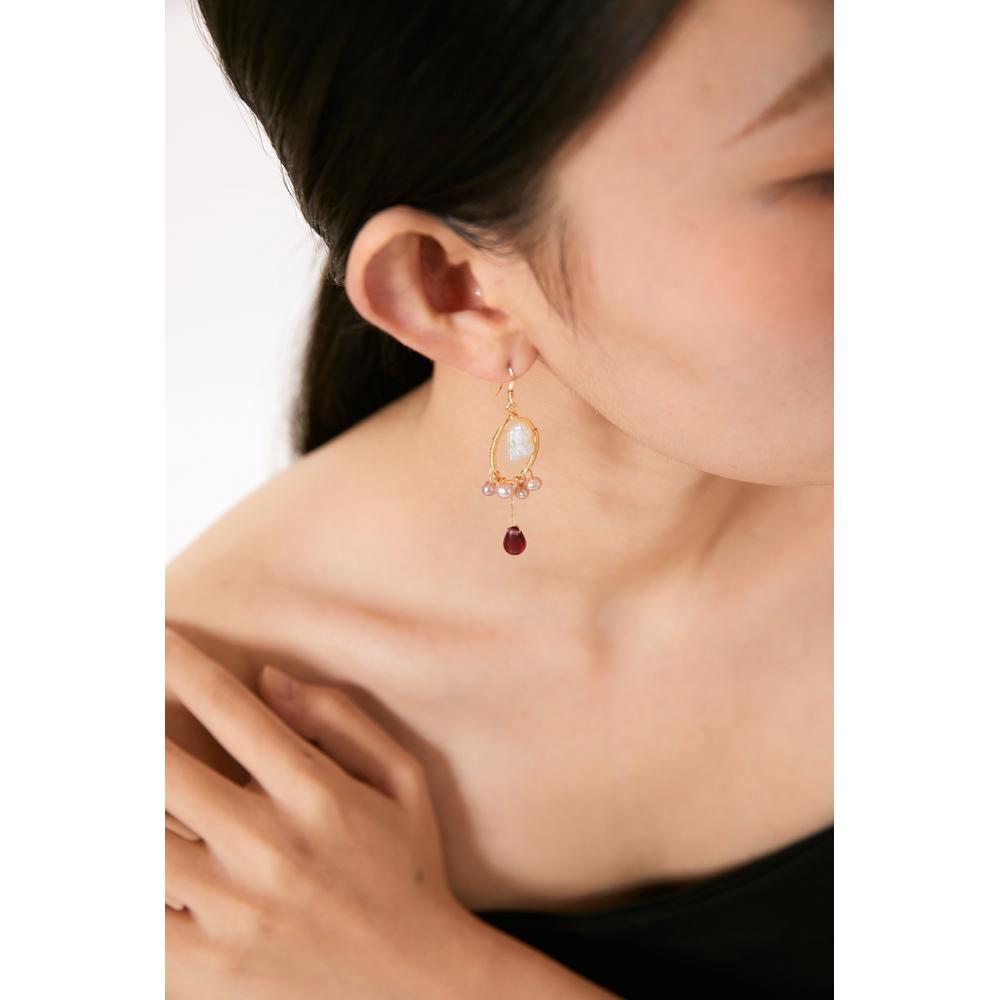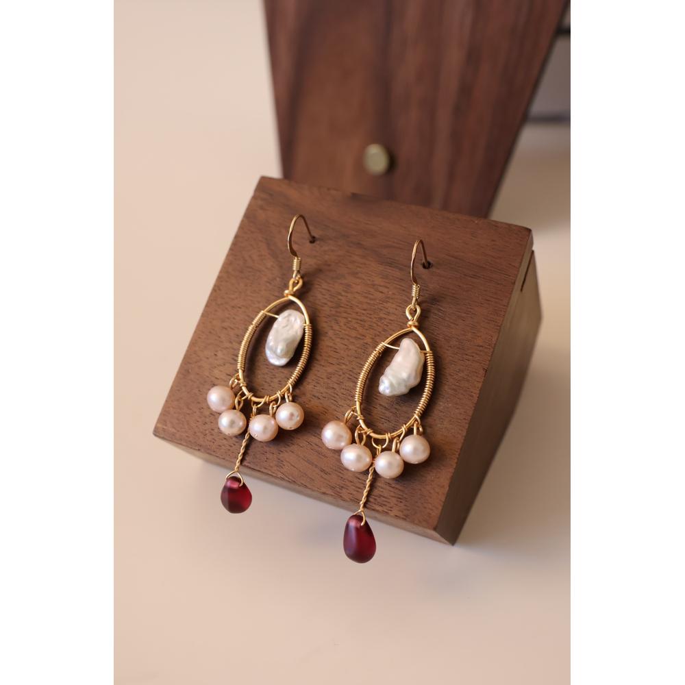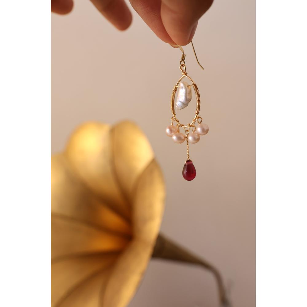 This exquisite piece is made from gold-plated materials, paired with natural freshwater pearls and red natural garnets.