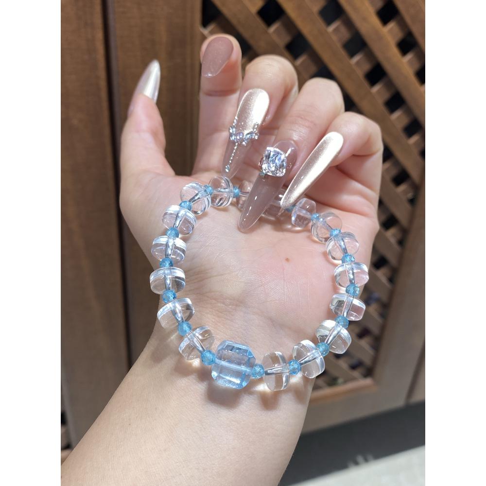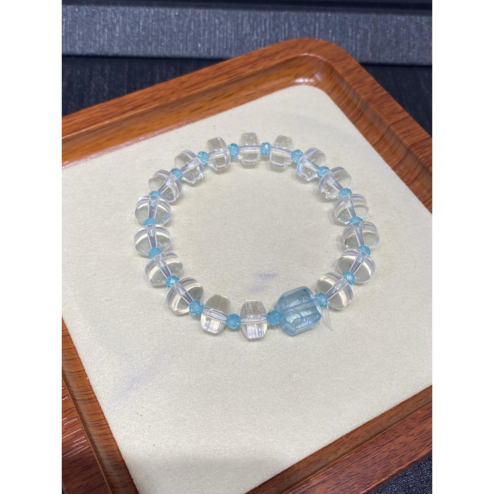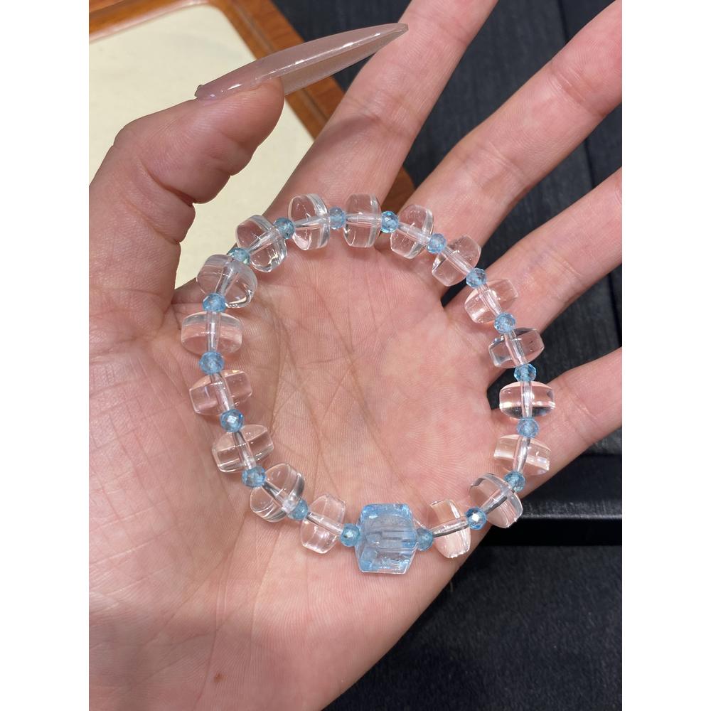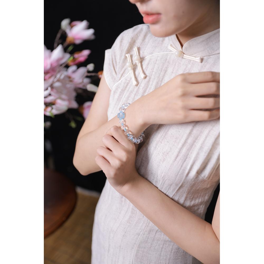Crafted with translucent crystal beads that mirror the purity of morning dew and azure – hued topaz beads echoing the calm of clear skies, Celeste Strand weaves nature’s serenity into every strand. The smooth textures of faceted crystal and rounded topaz create a tactile dialogue between earthly elements, inviting wearers to embrace the harmony of land and sky. Featuring square topaz beads about 10.6mm and crystal beads around 7 * 10mm, it fits wrist circumferences within 16cm gracefully. As light dances through its delicate forms, this piece not only embodies Thalassody Collection’s poetic essence but also whispers a promise—let the clarity of crystal awaken inner brightness, let the tranquility of azure soothe restless souls, guiding you toward a rebirth of peace and renewed spirit in daily life.