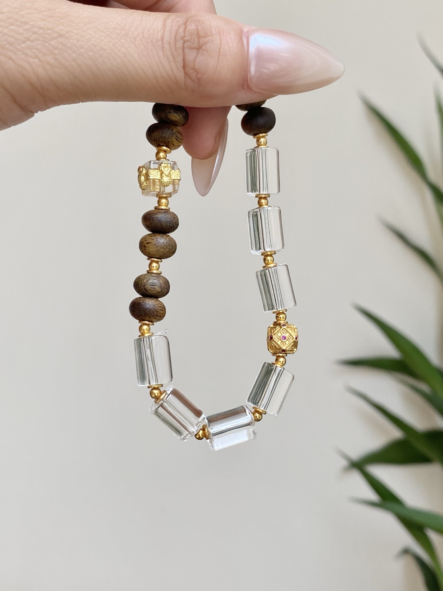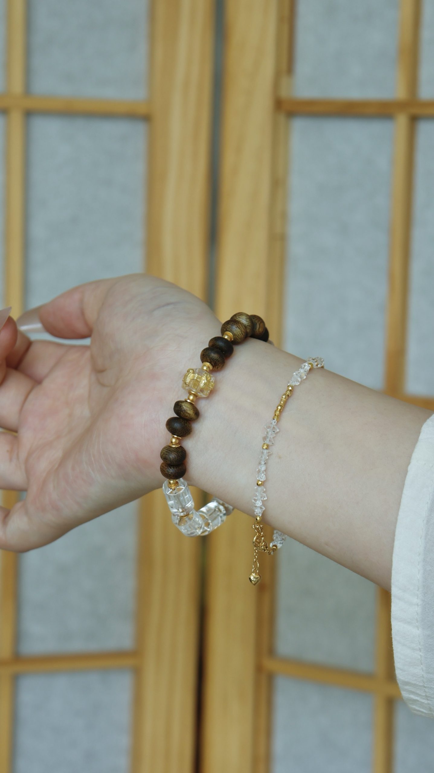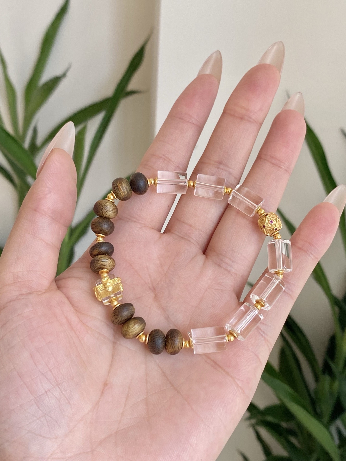 This bracelet unites the grounded warmth of agarwood with the translucent clarity of white quartz, accented by zircon’s starlike sparkle and 18k gold – plated 925 silver. Agarwood, rooted in ancient forests, anchors the spirit in earthy calm; white quartz, like morning dew on leaves, washes away mental fog. Zircon’s subtle gleam and gold’s elegance weave in celestial hope. Worn close, it harmonizes inner turbulence with nature’s balance—let the forest’s serenity soothe your soul, and may the dawn’s light renew your strength, bright as the first rays through trees.
