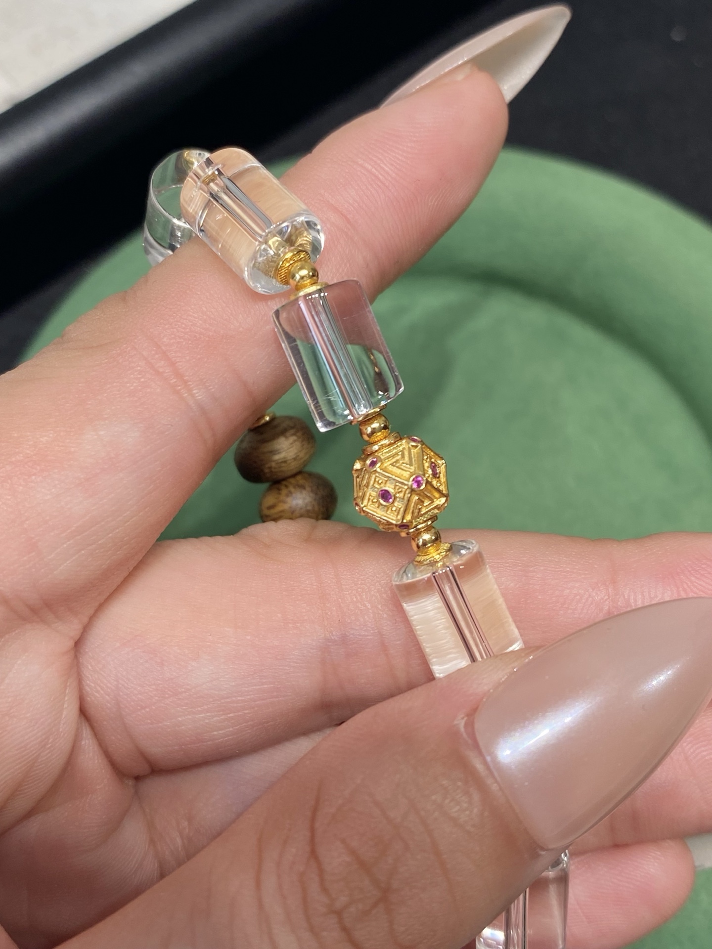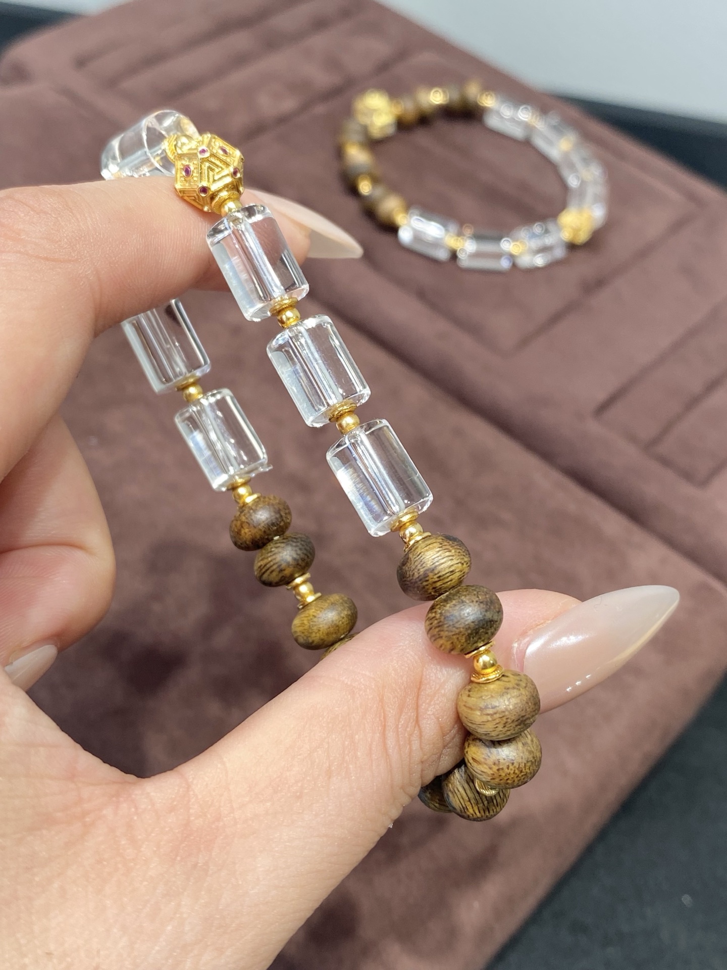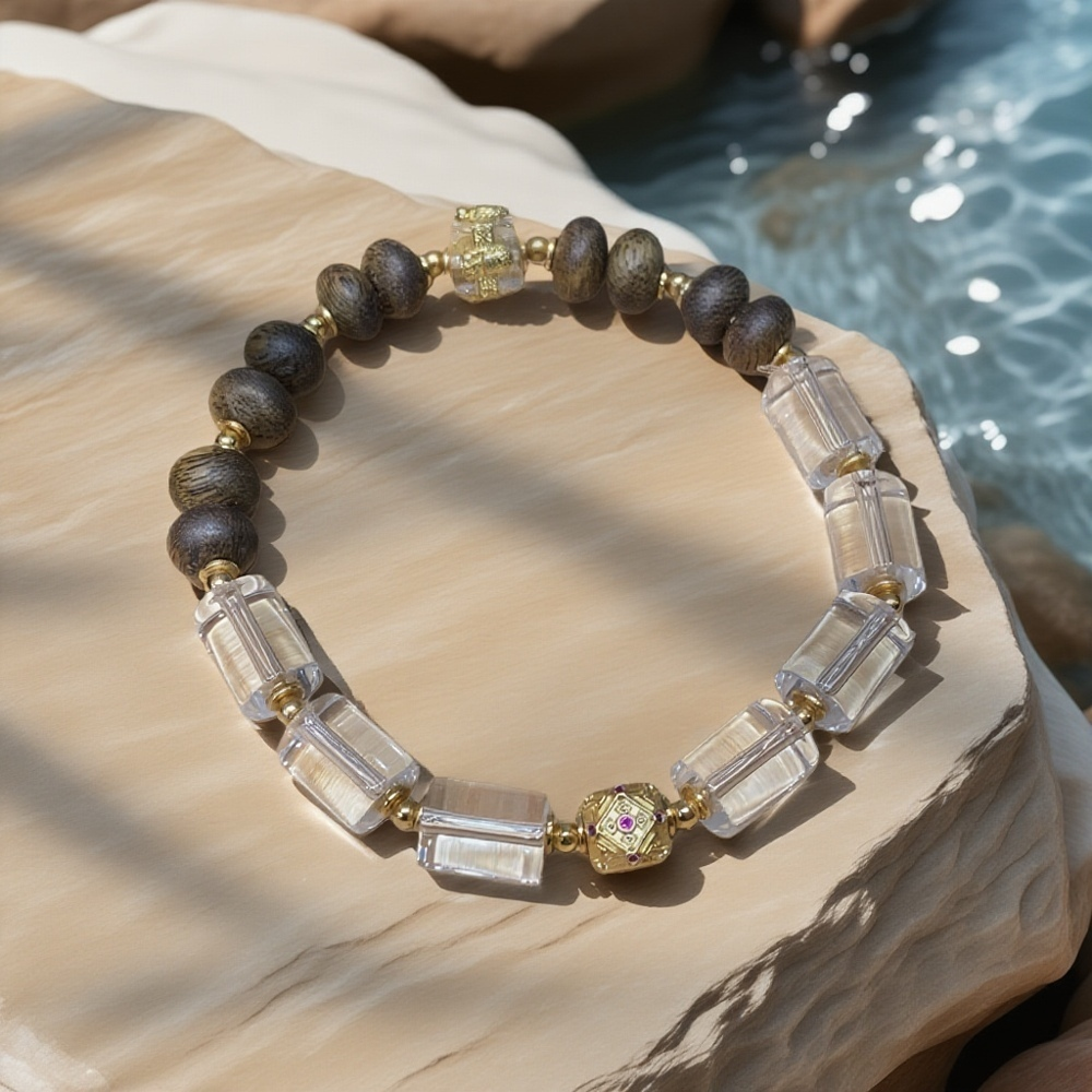 This bracelet unites the grounded warmth of agarwood with the translucent clarity of white quartz, accented by zircon’s starlike sparkle and 18k gold – plated 925 silver. Agarwood, rooted in ancient forests, anchors the spirit in earthy calm; white quartz, like morning dew on leaves, washes away mental fog. Zircon’s subtle gleam and gold’s elegance weave in celestial hope. Worn close, it harmonizes inner turbulence with nature’s balance—let the forest’s serenity soothe your soul, and may the dawn’s light renew your strength, bright as the first rays through trees.