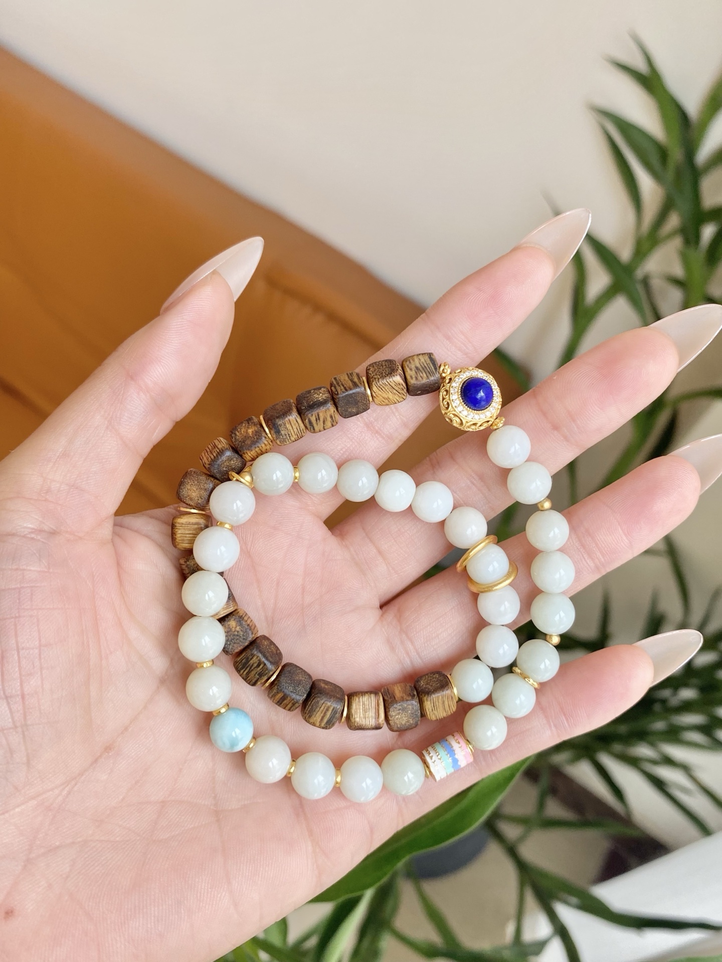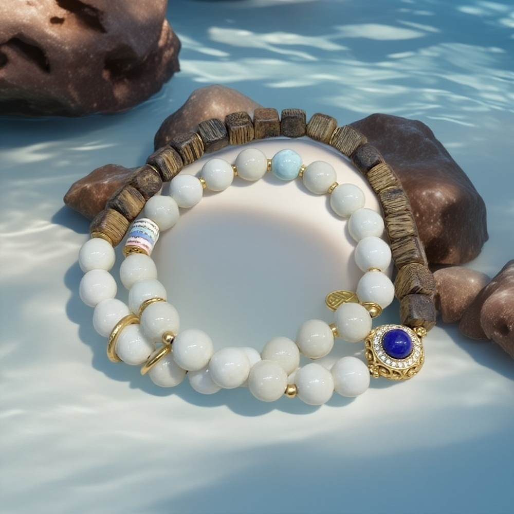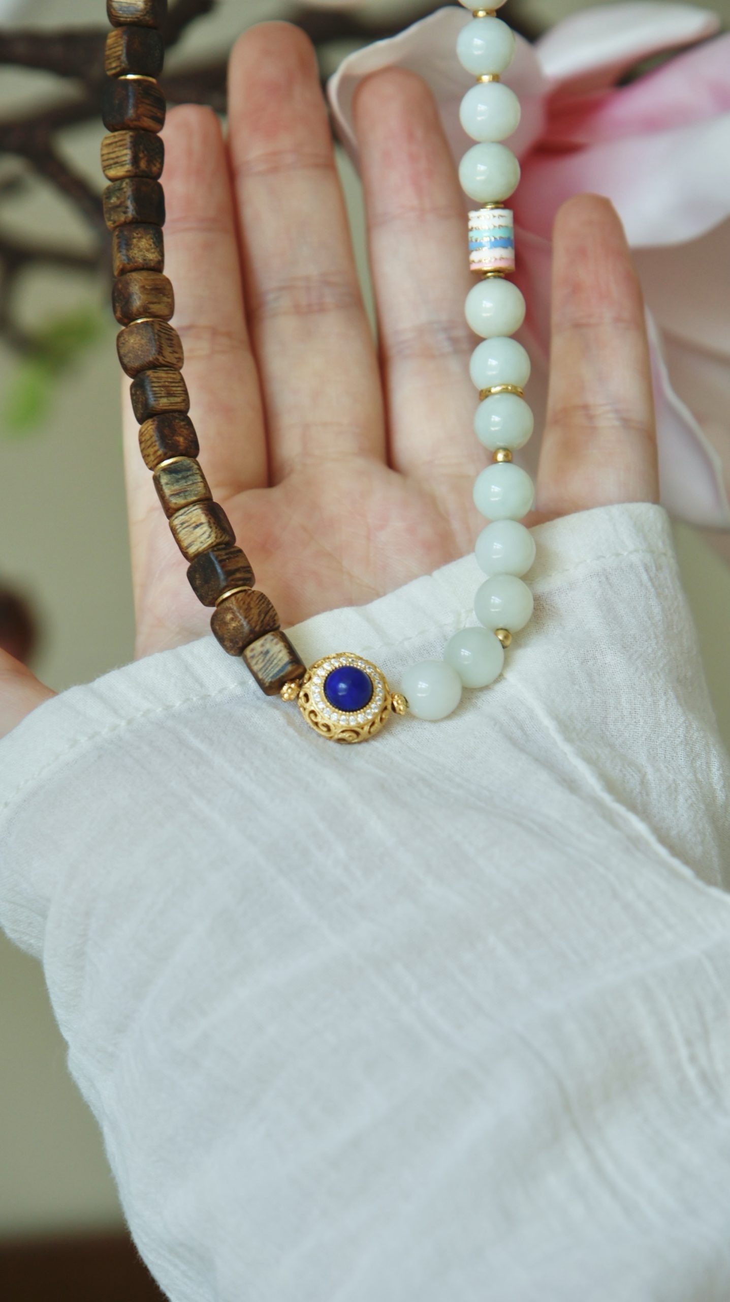 Lunaria Silvestris weaves the nocturnal tale of earth and sky. Silken white beads, like condensed moonlight pooling on ancient branches, mingle with dark – hued wooden beads that hum with the whispers of century – old trees. A sapphire – studded medallion glows at its core, mimicking a star fallen from the Milky Way, while delicate gold filigree catches the faintest flicker of starlight. Crafted with white jade, sandalwood, sapphire, and 18k gold plating, this bracelet invites you to cradle the night’s serenity — Let the tender rhythm of moonlit jade soothe your soul, guiding you toward the dawn’s rebirth—its glow as timeless as tides, while the forest’s profound wisdom etches pathways to renewal.