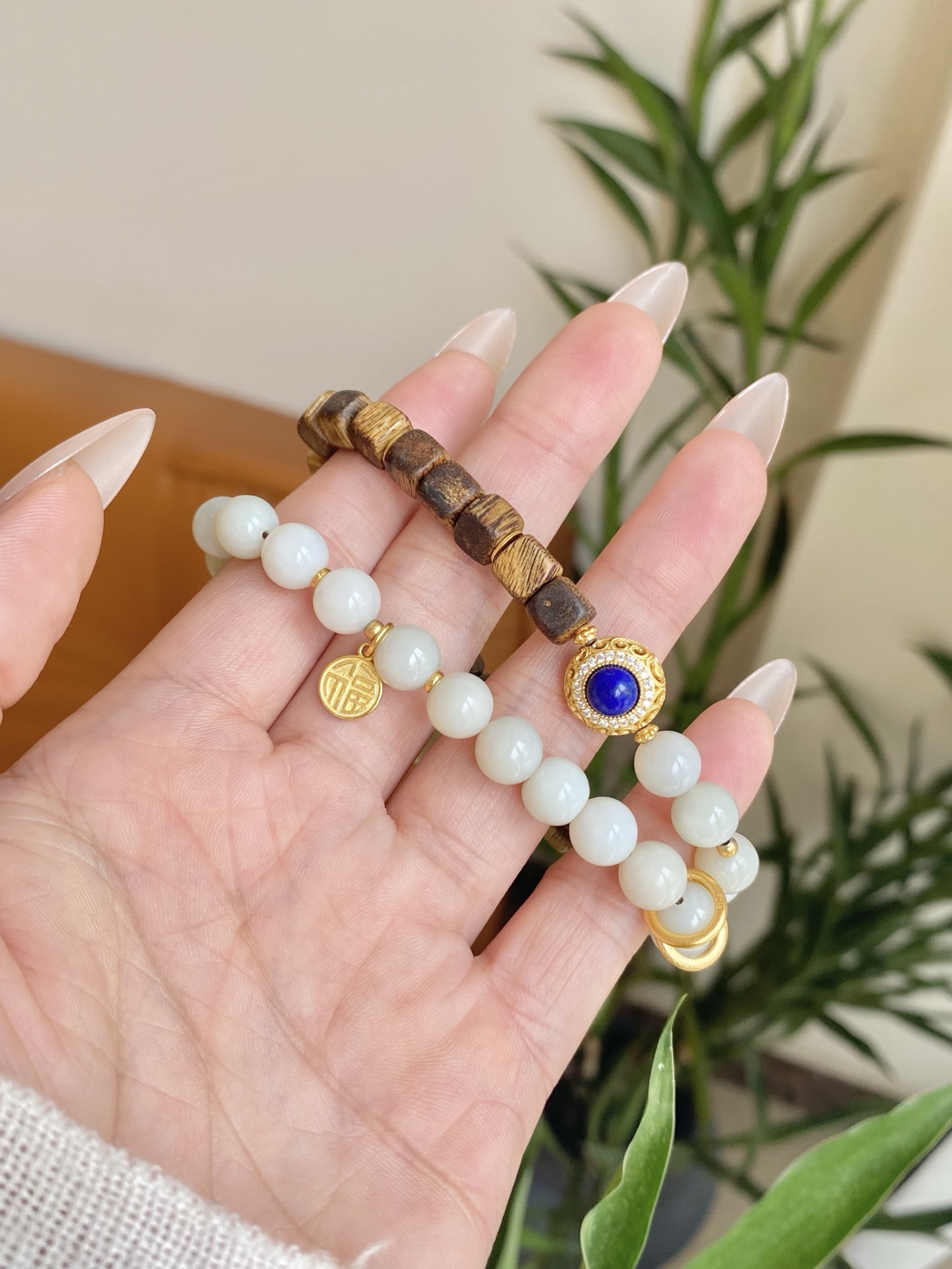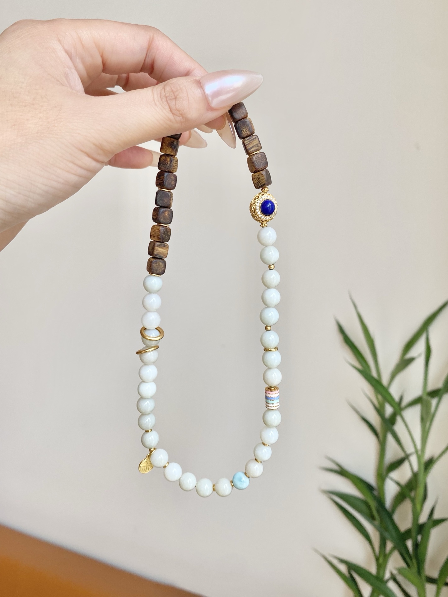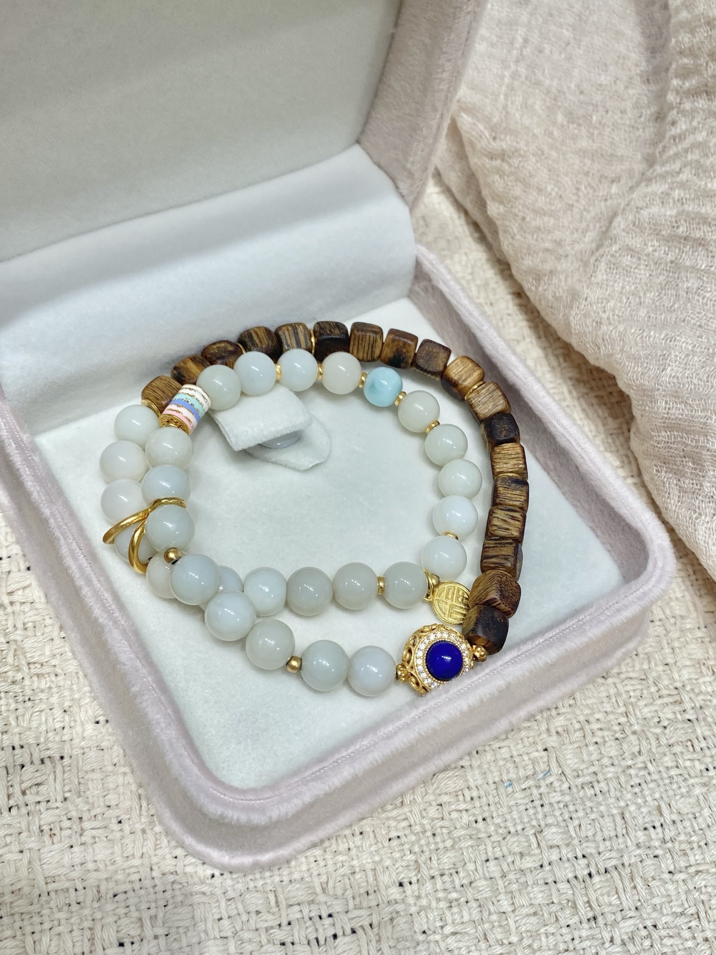 Lunaria Silvestris weaves the nocturnal tale of earth and sky. Silken white beads, like condensed moonlight pooling on ancient branches, mingle with dark – hued wooden beads that hum with the whispers of century – old trees. A sapphire – studded medallion glows at its core, mimicking a star fallen from the Milky Way, while delicate gold filigree catches the faintest flicker of starlight. Crafted with white jade, sandalwood, sapphire, and 18k gold plating, this bracelet invites you to cradle the night’s serenity — Let the tender rhythm of moonlit jade soothe your soul, guiding you toward the dawn’s rebirth—its glow as timeless as tides, while the forest’s profound wisdom etches pathways to renewal.