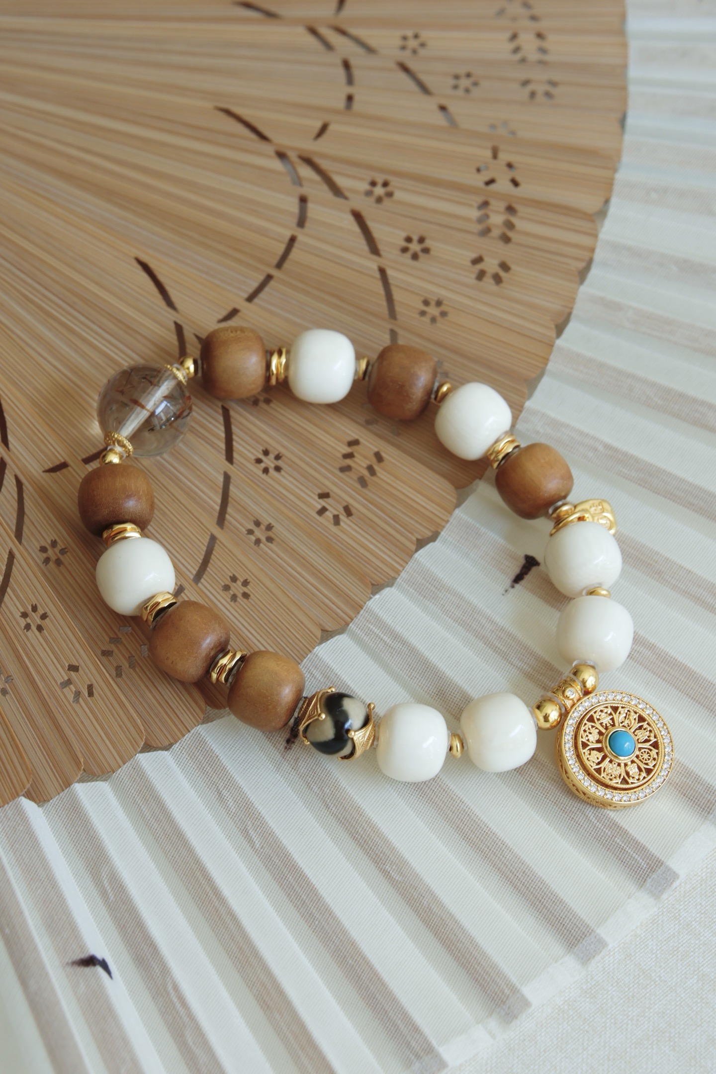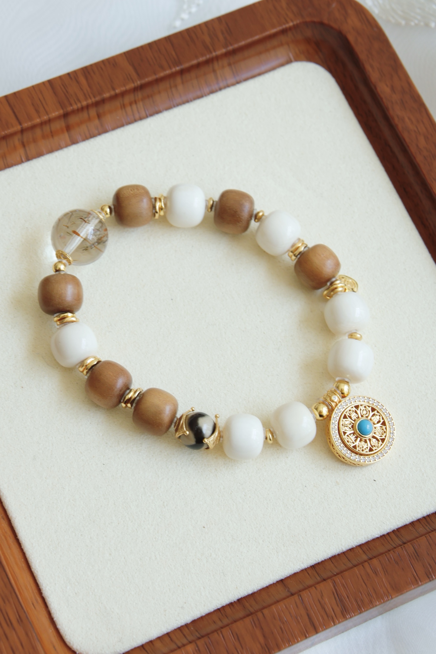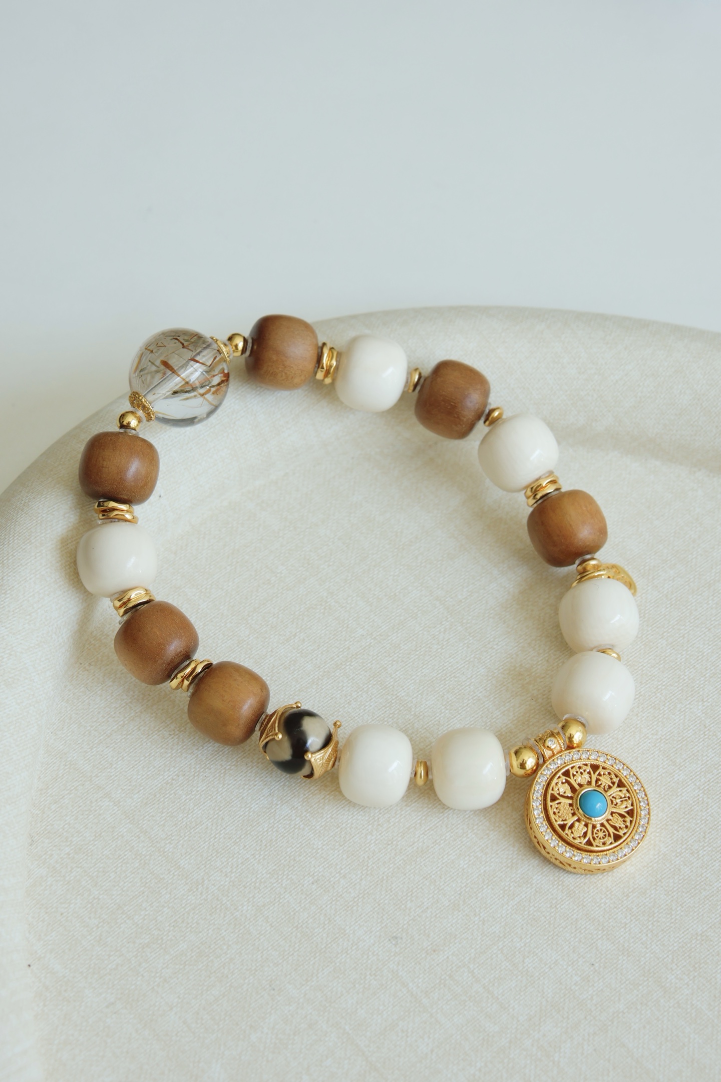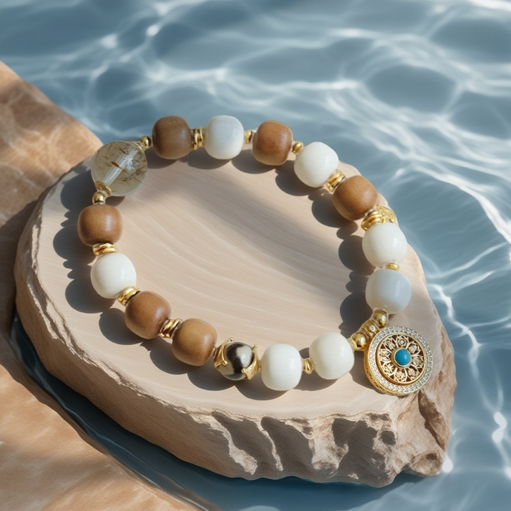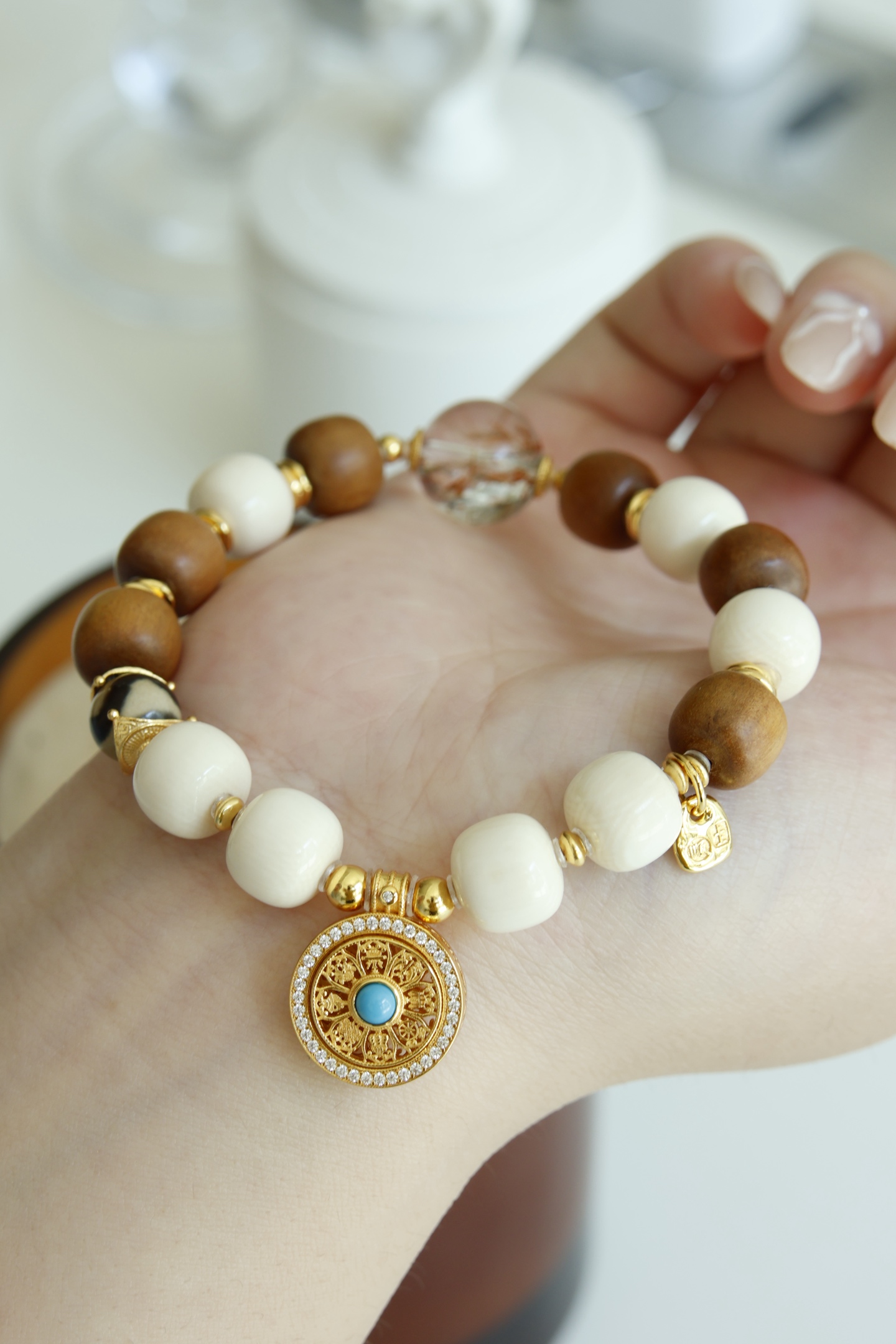 Temple of Six Jewels intertwines the wisdom of nature and sacred artistry through six curated gems—smooth cedar beads grounding earthly energy, pearlescent white orbs capturing lunar clarity, golden amber veins channeling sunlight, and a central turquoise – encrusted medallion symbolizing celestial protection. Each element is woven with 18k gold – plated filigree, evoking the grandeur of ancient temples where earthly and divine realms converge. In Eosia Collection’s philosophy of “pearls narrate virtues, dawn ushers rebirth”, this bracelet invites you to wear the harmony of six elements: cedar (resilience), pearl (purity), amber (vitality), turquoise (serenity), gold (abundance), and crystal (enlightenment). Let their whispers awaken your inner light, guiding you toward renewal rooted in nature’s timeless wisdom and the sanctity of self – discovery.