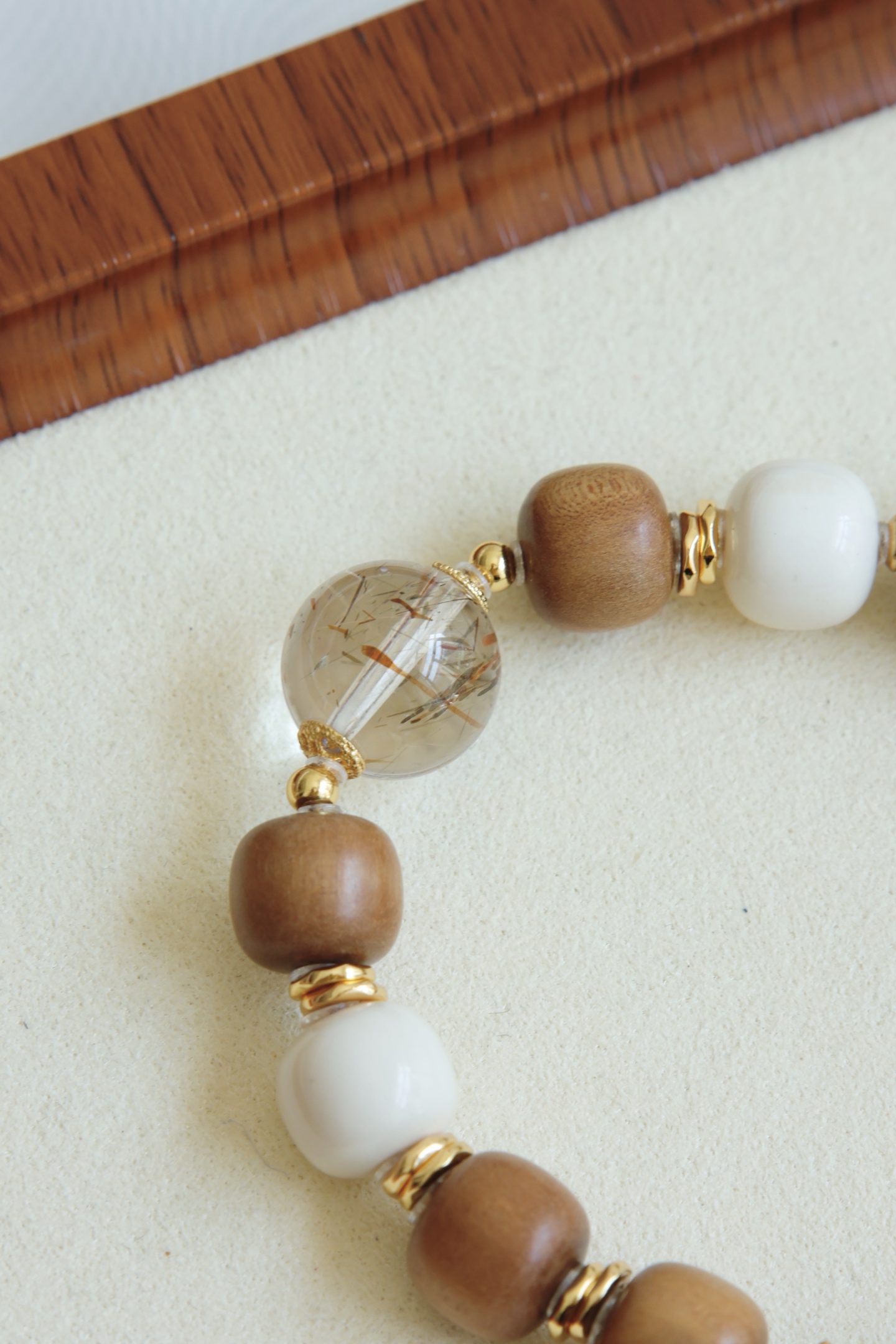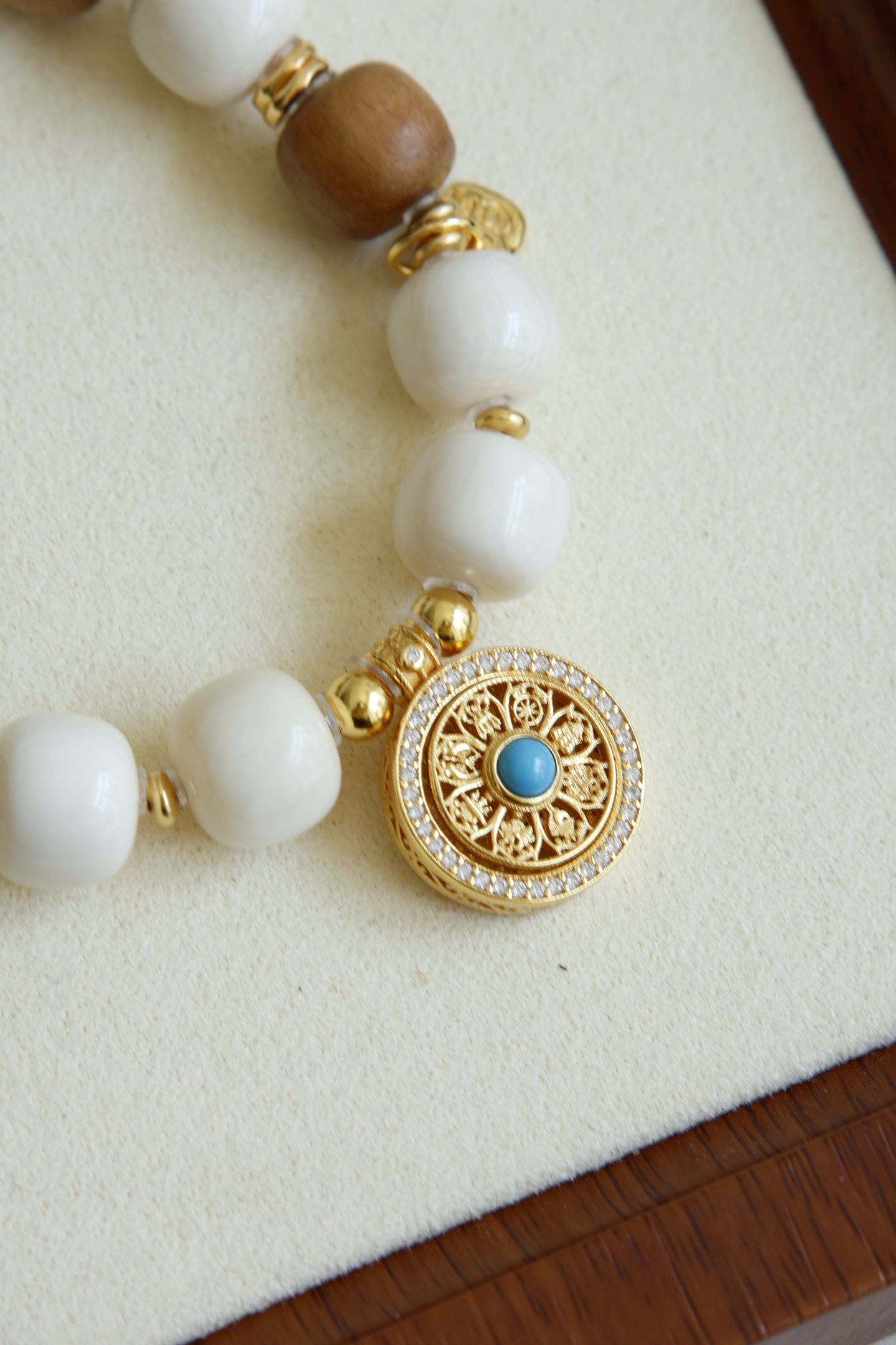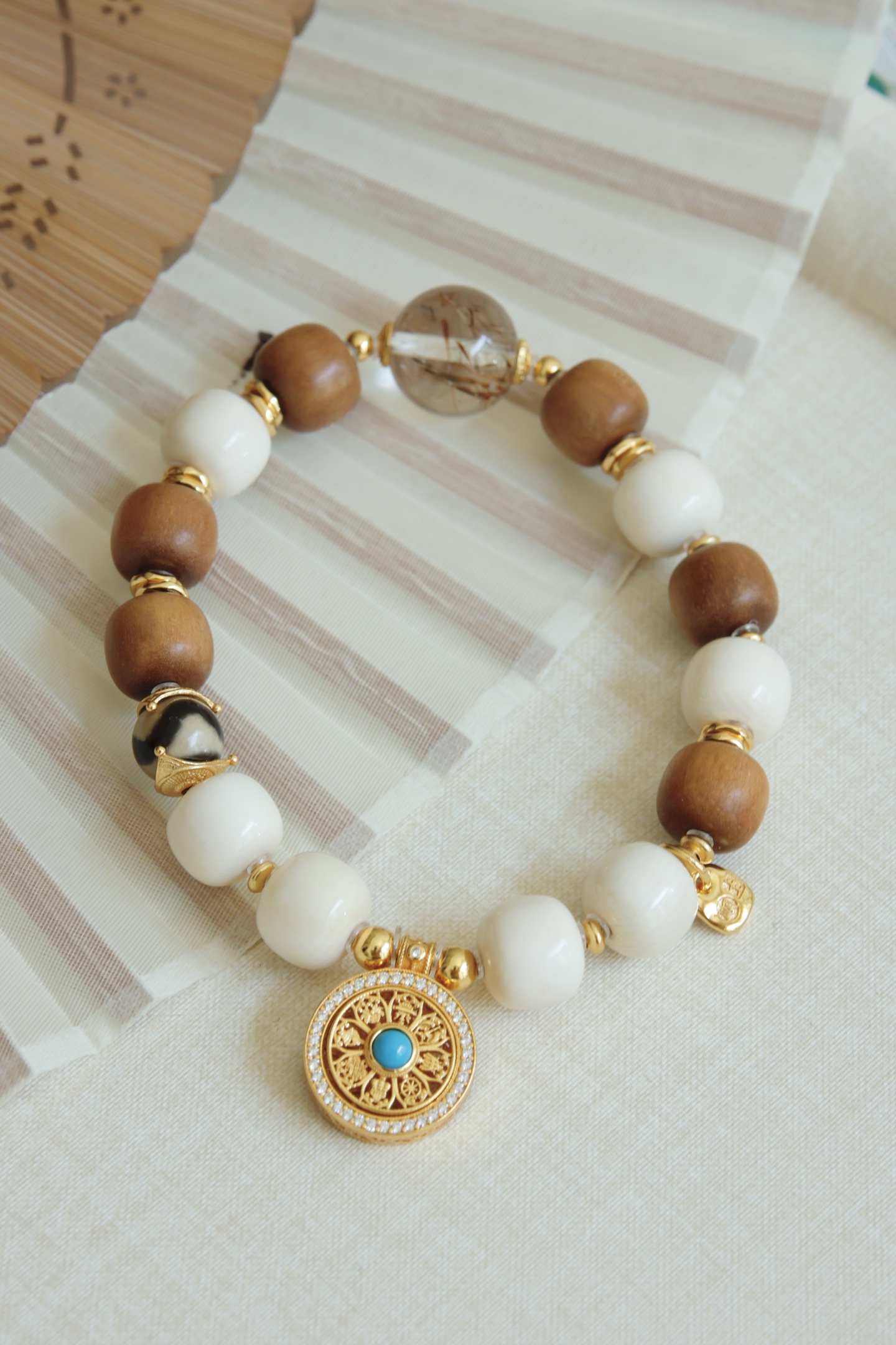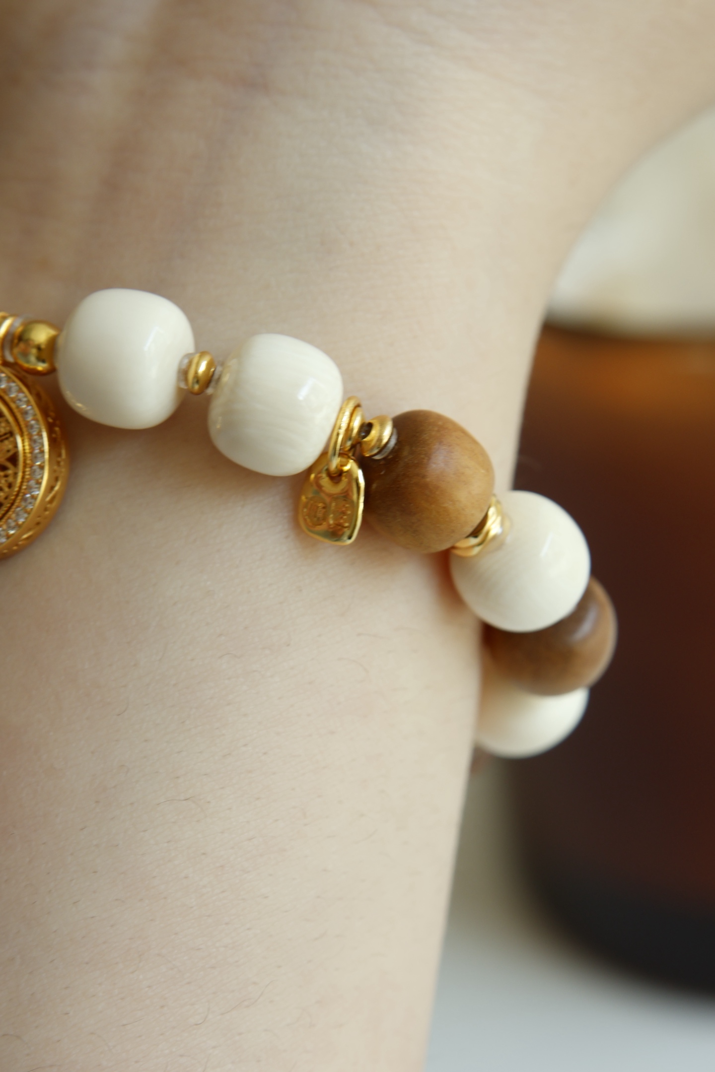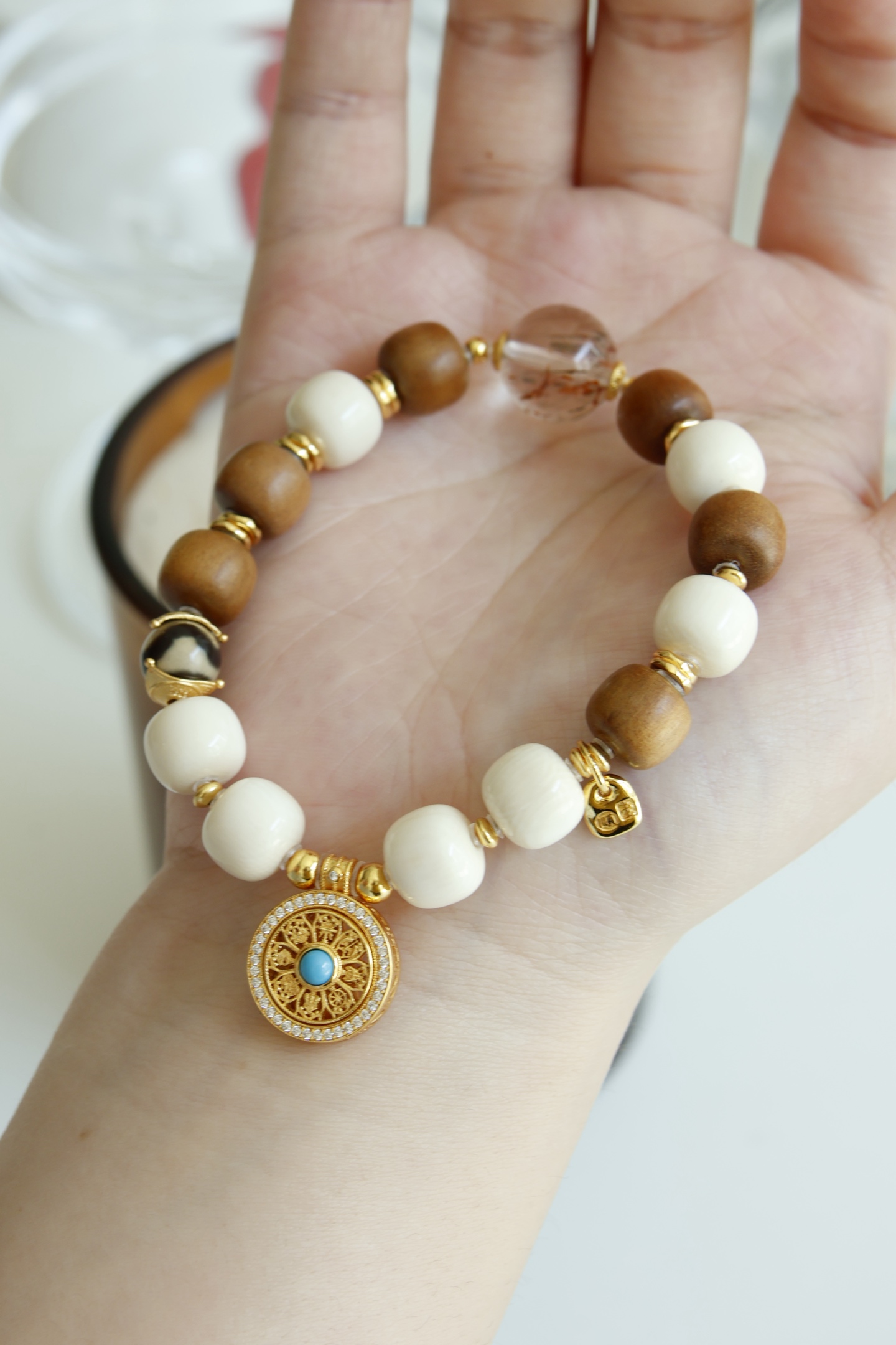 Temple of Six Jewels intertwines the wisdom of nature and sacred artistry through six curated gems—smooth cedar beads grounding earthly energy, pearlescent white orbs capturing lunar clarity, golden amber veins channeling sunlight, and a central turquoise – encrusted medallion symbolizing celestial protection. Each element is woven with 18k gold – plated filigree, evoking the grandeur of ancient temples where earthly and divine realms converge. In Eosia Collection’s philosophy of “pearls narrate virtues, dawn ushers rebirth”, this bracelet invites you to wear the harmony of six elements: cedar (resilience), pearl (purity), amber (vitality), turquoise (serenity), gold (abundance), and crystal (enlightenment). Let their whispers awaken your inner light, guiding you toward renewal rooted in nature’s timeless wisdom and the sanctity of self – discovery.