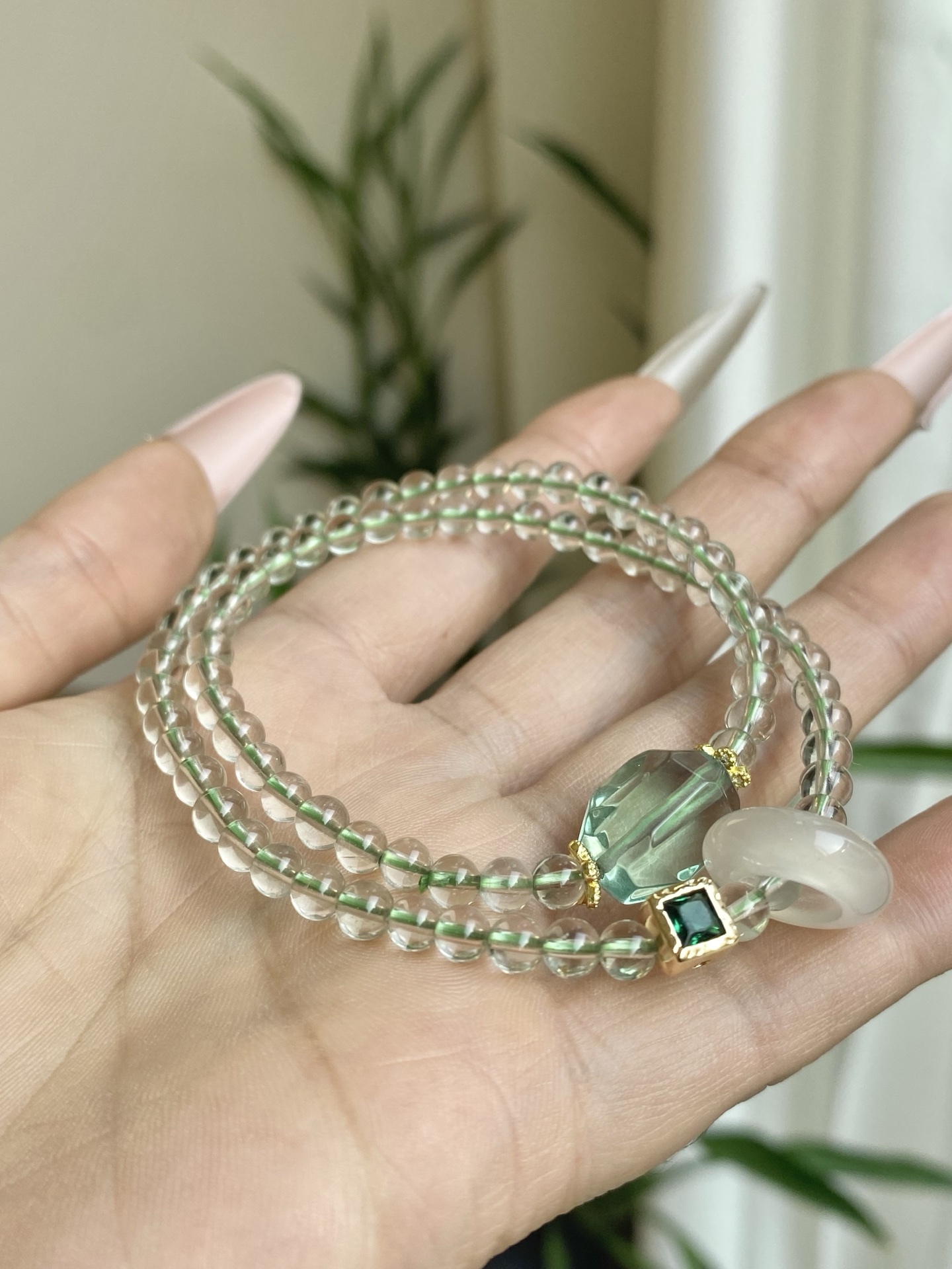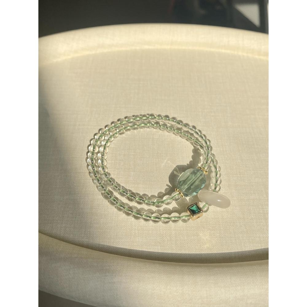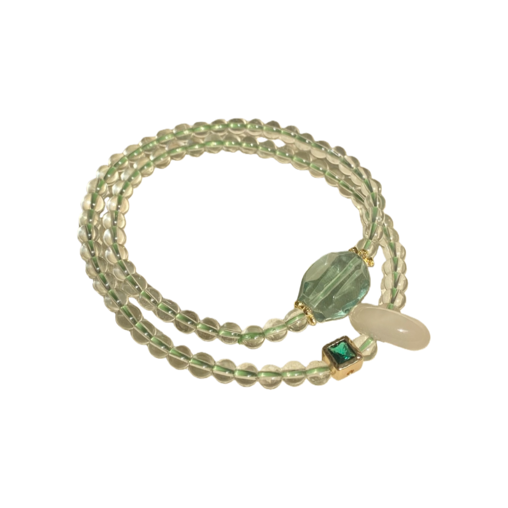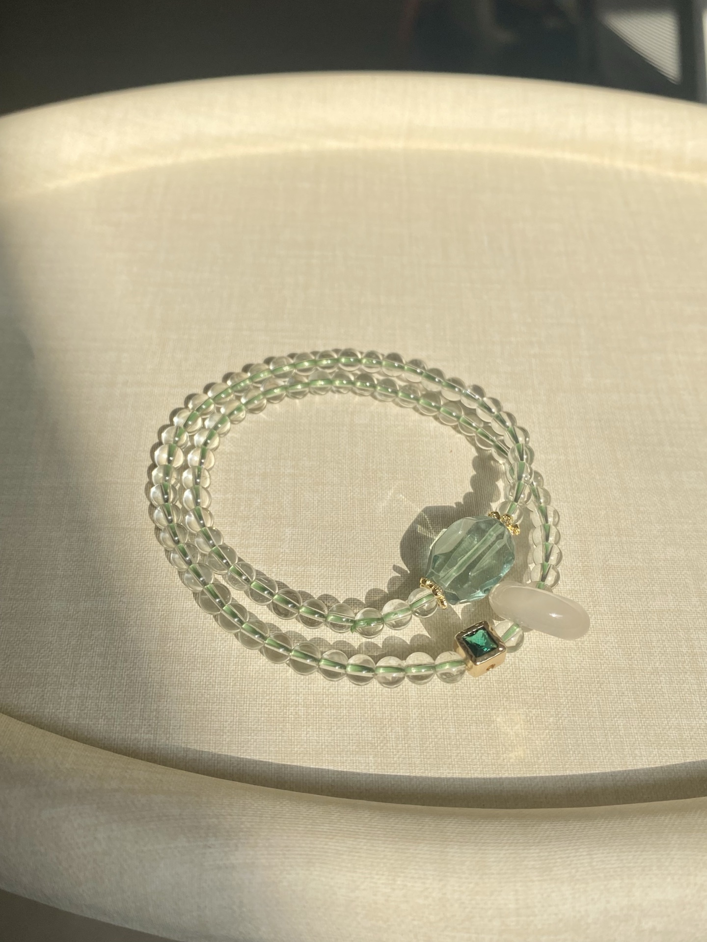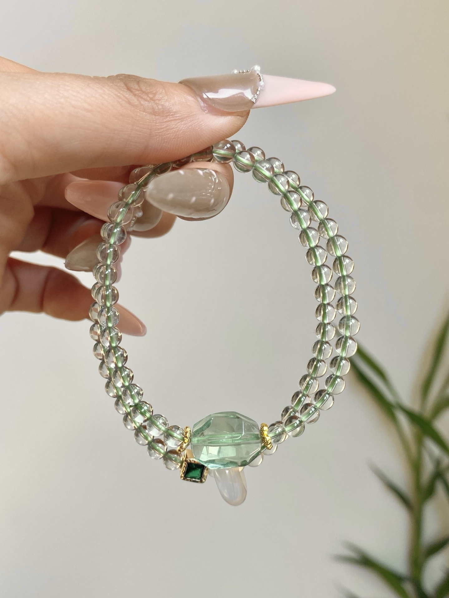 Crafted with translucent green fluorite beads (evoking forest dew) and clear white agate (pure as morning mist), this bracelet anchors on a multifaceted green zircon—the “heart stone”—its facets catching light like sunlit leaves. Delicate gold accents on the zircon and trim mirror dewdrops on grass, while an elastic band ensures a snug, comfortable fit (16cm circumference, 4mm beads). Fluorite’s earthy freshness grounds you in nature’s stability; agate’s milky serenity calms the mind’s chatter; zircon’s vibrant hue inspires growth—just as seedlings reach for sunlight. Let this piece be your bridge to the wild: wear it to shed stress, awaken inner vitality, and step into dawn’s promise—renewed, rooted, and ready to bloom.