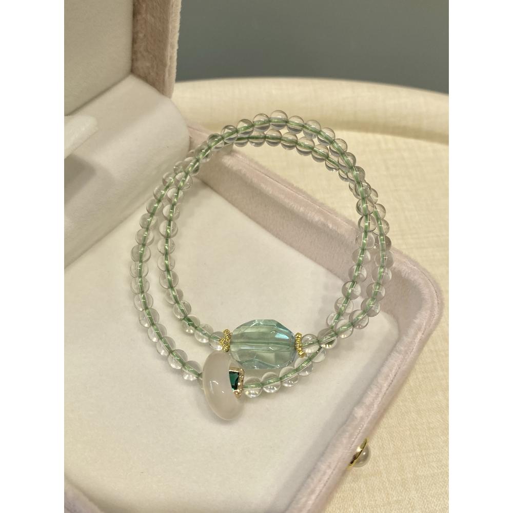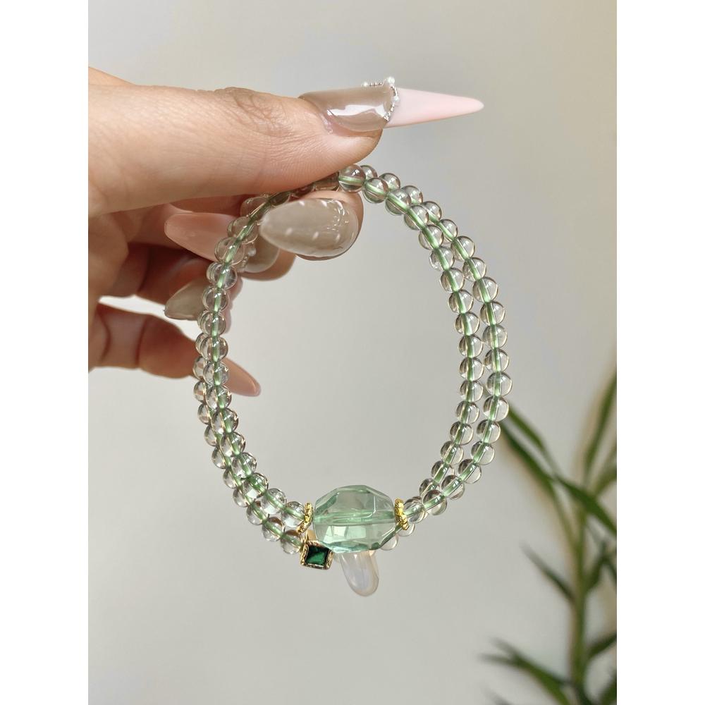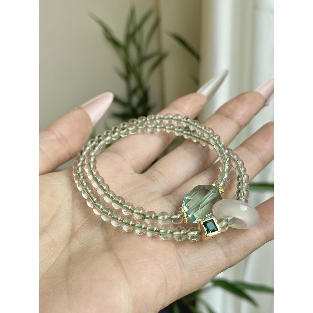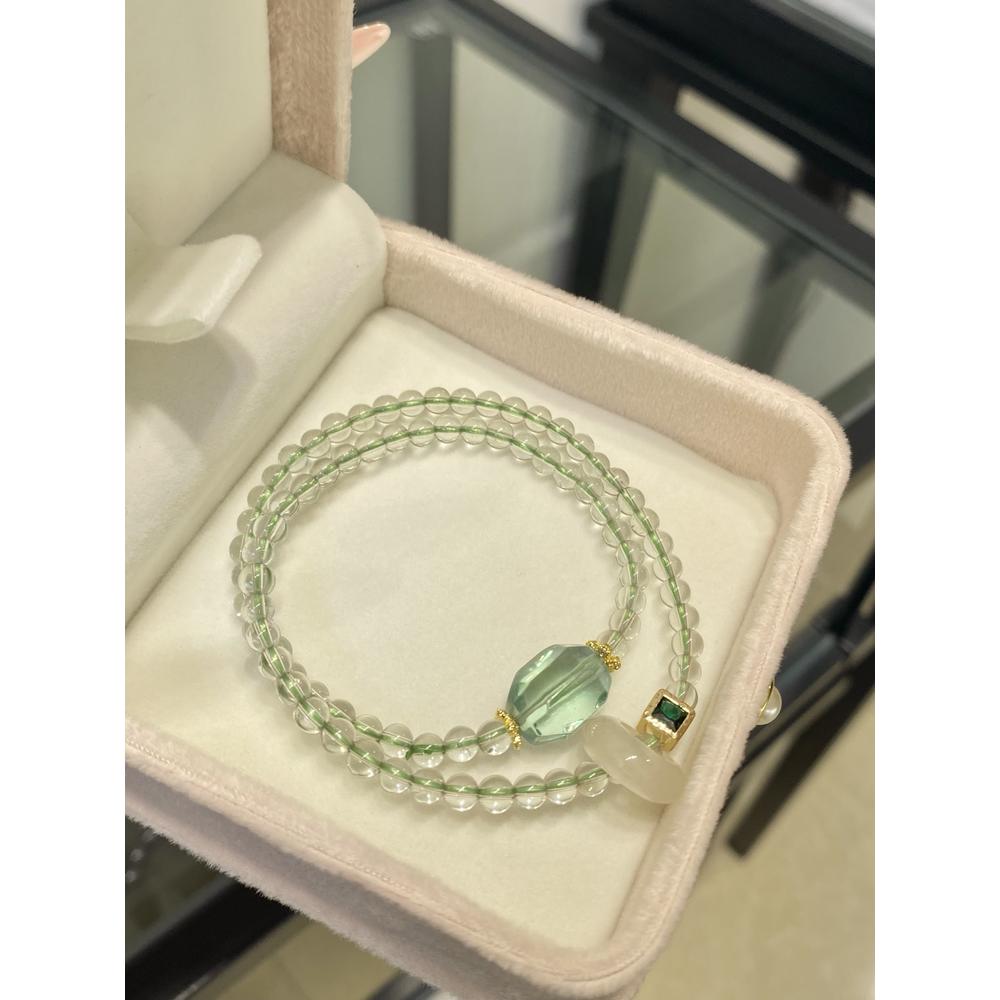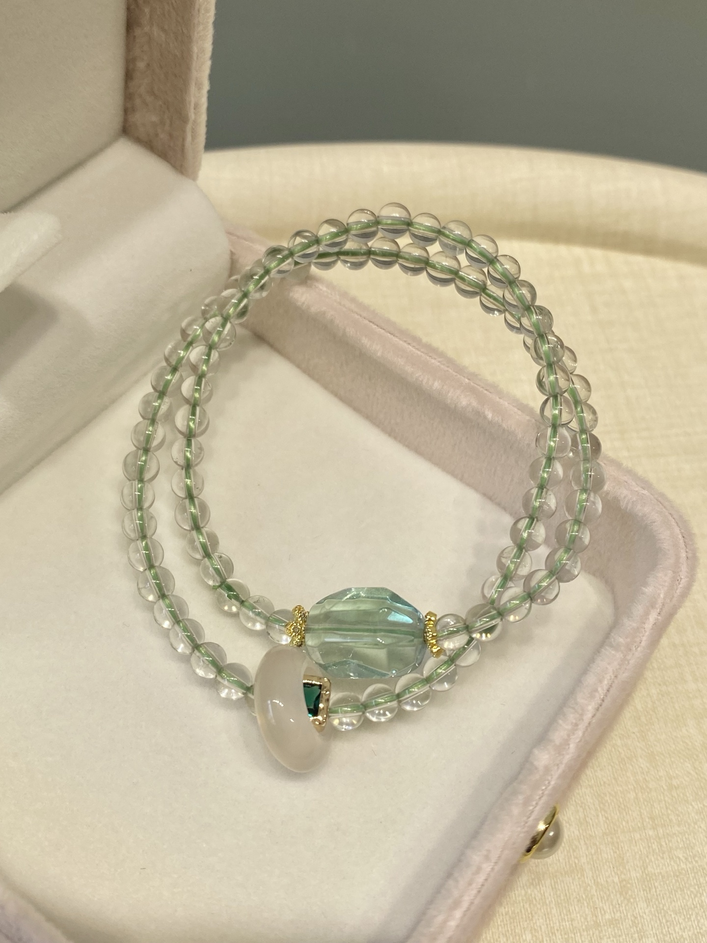 Crafted with translucent green fluorite beads (evoking forest dew) and clear white agate (pure as morning mist), this bracelet anchors on a multifaceted green zircon—the “heart stone”—its facets catching light like sunlit leaves. Delicate gold accents on the zircon and trim mirror dewdrops on grass, while an elastic band ensures a snug, comfortable fit (16cm circumference, 4mm beads). Fluorite’s earthy freshness grounds you in nature’s stability; agate’s milky serenity calms the mind’s chatter; zircon’s vibrant hue inspires growth—just as seedlings reach for sunlight. Let this piece be your bridge to the wild: wear it to shed stress, awaken inner vitality, and step into dawn’s promise—renewed, rooted, and ready to bloom.